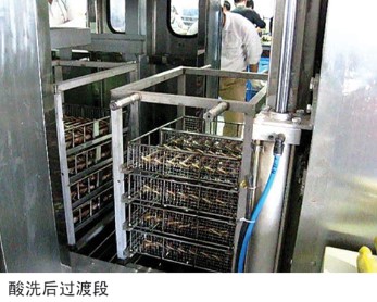人工將工件放置于吊籃內(nèi),然后將吊籃放在小車上送至上件處( 人工定位)。整套設(shè)備由PLC可編程控制器控制,機(jī)械手自動(dòng)將吊籃放入酸洗槽,酸洗時(shí)間(節(jié)拍)根據(jù)工件的產(chǎn)量及工件的污染狀態(tài)可調(diào),到達(dá)設(shè)定時(shí)間后,機(jī)械手依次將吊籃放入下道清洗槽,直至將吊籃放入過(guò)渡段輸送鏈上,經(jīng)烘干、風(fēng)冷后人工下件。